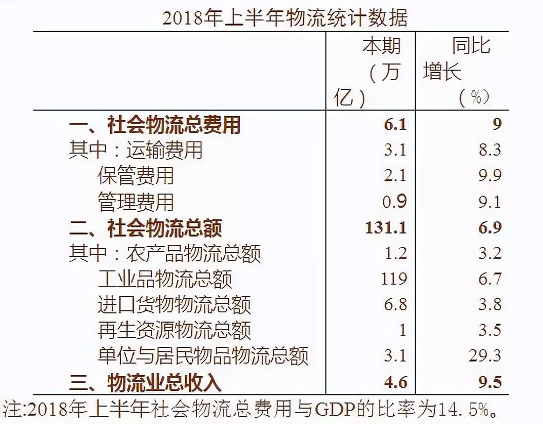 2018年1-6月,社會(huì)物流總費(fèi)用為6.1萬(wàn)億元,同比增長(zhǎng)9%,增速比一季度提高2個(gè)百分點(diǎn);物流市場(chǎng)規(guī)模穩(wěn)步增長(zhǎng),物流業(yè)總收入為4.6萬(wàn)億元,同比增長(zhǎng)9.5%,增速比一季度提高1.3個(gè)百分點(diǎn)。